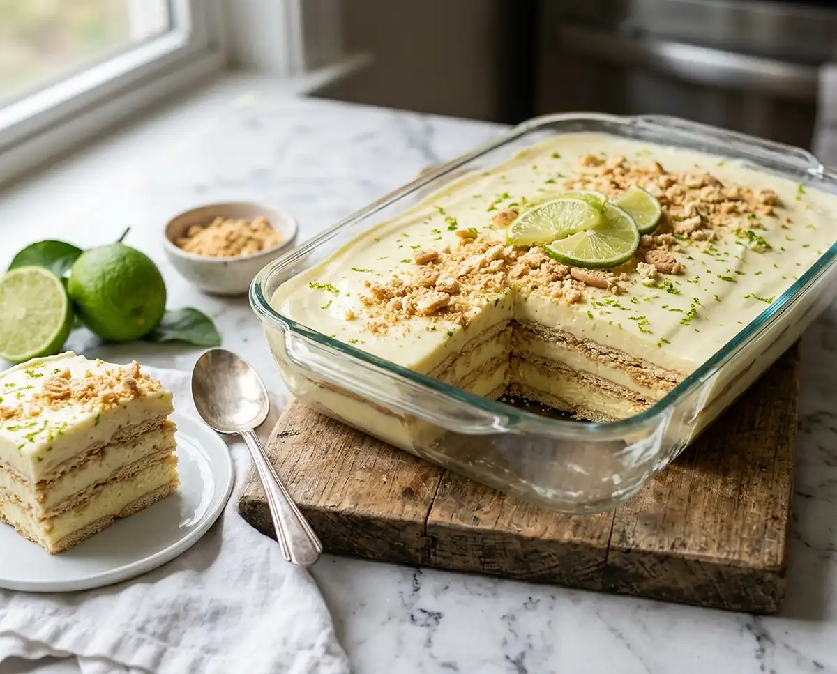 At minimum, 3 hours — but overnight produces a much better texture. The extra chill time allows the cookies to fully soften and the lime cream to firm up into clean, sliceable layers.