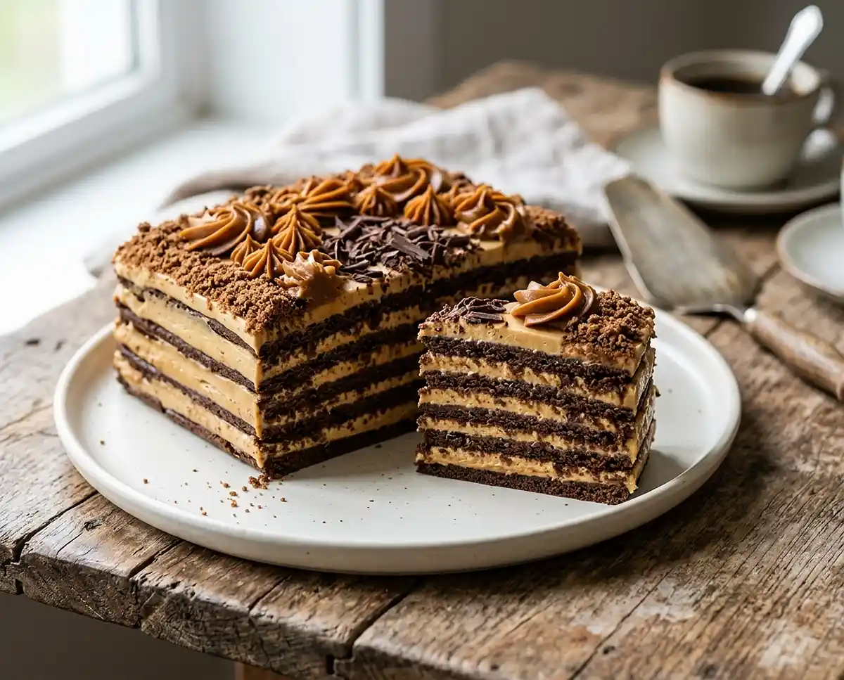 By the time you serve it, every Chocolinas cookie has soaked up the coffee soak and dulce de leche filling until the whole thing slices like a dream โ no oven, no mixer, no stress.
