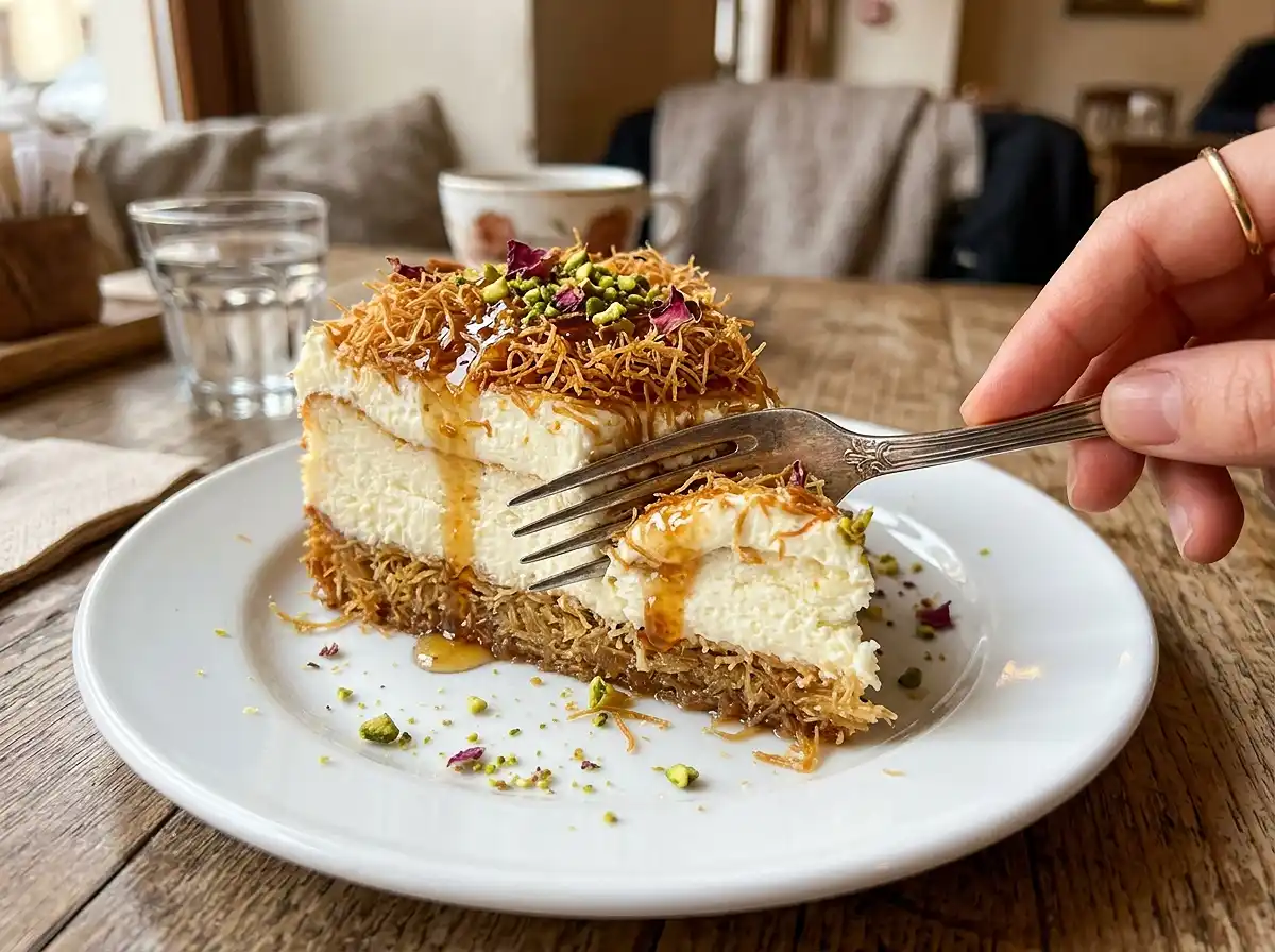 The texture combination is absolutely unreal. You get that shatteringly crispy base soaked in sweet syrup, a layer of impossibly creamy cheesecake, and then the whole thing is crowned with silky keshta cream and more crispy kataifi. Every bite is a journey.