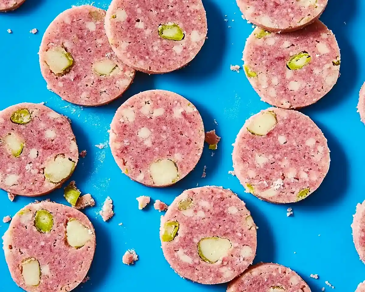 Mortadella cookies are whimsical strawberry almond slice-and-bake cookies studded with macadamia nuts and pistachios that create an uncanny resemblance to Italian mortadella sausage when sliced. The pink freeze-dried strawberry dough, speckled with chopped nuts and coated in sparkling sanding sugar, delivers a buttery, nutty sweetness with subtle almond and berry notes in every tender bite.