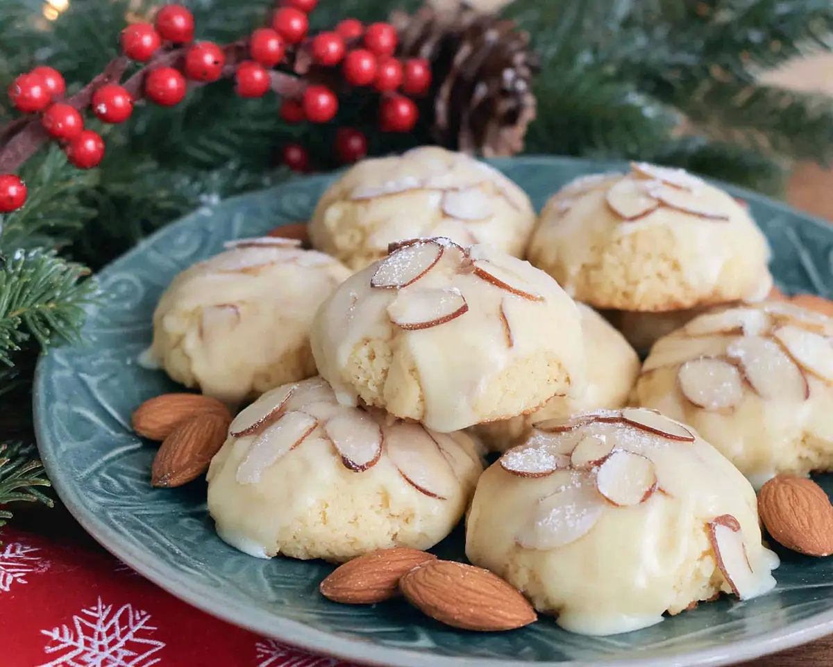 - For the almond glaze, whisk together the powdered sugar, milk, and half teaspoon of almond extract in a small bowl until smooth. Hold each cooled cookie upside down and dip the top into the glaze, letting excess drip off. Return to the wire rack and immediately sprinkle with sliced almonds if using. Let the glaze set completely, about 30 minutes.